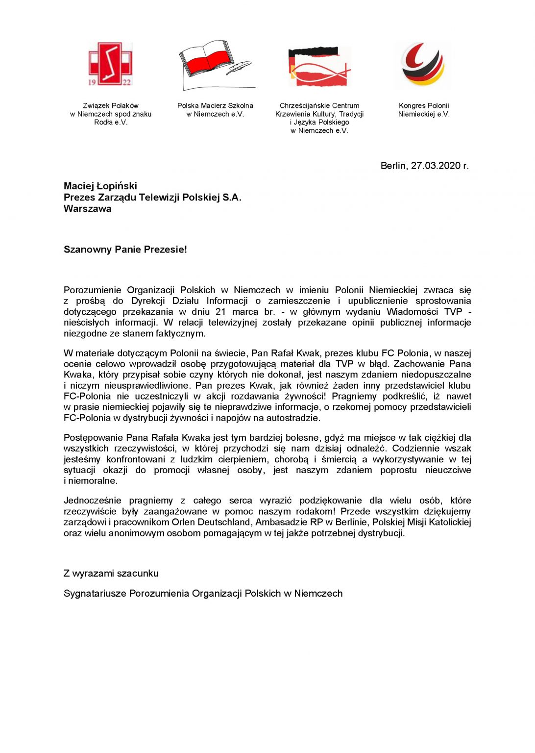 W materiale dotyczącym Polonii na świecie, Pan Rafał Kwak, prezes klubu FC Polonia, w naszej ocenie celowo wprowadził osobę przygotowującą materiał dla TVP w błąd. Zachowanie Pana Kwaka, który przypisał sobie czyny których nie dokonał, jest naszym zdaniem niedopuszczalne i niczym nieusprawiedliwione. Pan prezes Kwak, jak również żaden inny przedstawiciel klubu FC-Polonia nie uczestniczyli w akcji rozdawania żywności! Pragniemy podkreślić, iż nawet w prasie niemieckiej pojawiły się te nieprawdziwe informacje, o rzekomej pomocy przedstawicieli FC-Polonia w dystrybucji żywności i napojów na autostradzie.
