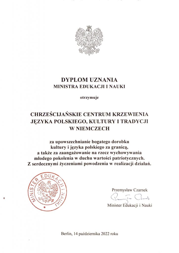 Dyplom taki w imieniu Chrześcijańskiego Centrum odebrał przewodniczący ks. dr Adam Prorok. Podobne dyplomy odebrali również przedstawiciele szkół ChC z Hanau, Lipska, Drezna, Berlina i Münster.