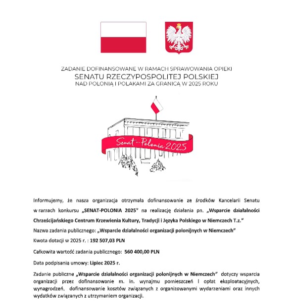 Informujemy, że nasza organizacja otrzymała dofinansowanie ze środków Kancelarii Senatu w ramach konkursu „SENAT-POLONIA 2025” na realizację działania pn. „Wsparcie działalności Chrześcijańskiego Centrum Krzewienia Kultury, Tradycji i Języka Polskiego w Niemczech T.z.”